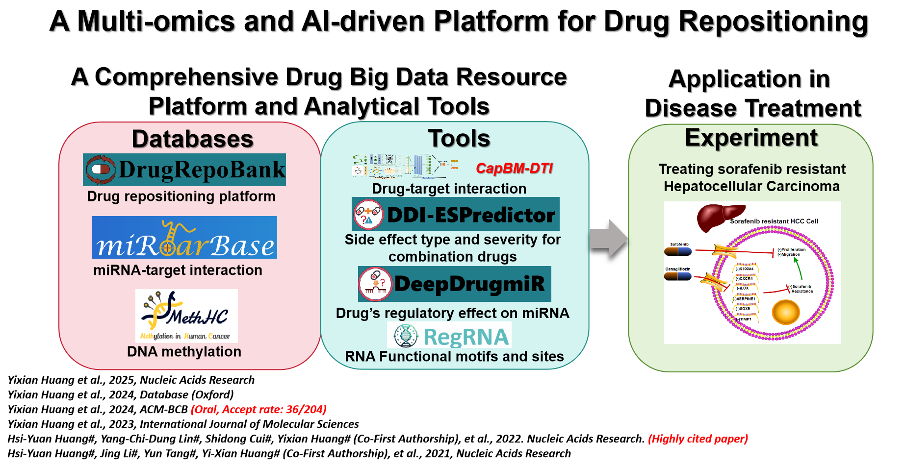 I am primarily focused on the development of DrugRepoSuite, a platform for drug repositioning, which enables the discovery of drug targets, new indications for drugs, side effects of co-administered drugs, and miRNA regulation of drugs. We are also exploring the treatment of sorafenib-resistant hepatocellular carcinoma using the developed platform and conducting experimental validation (in collaboration with biologists).